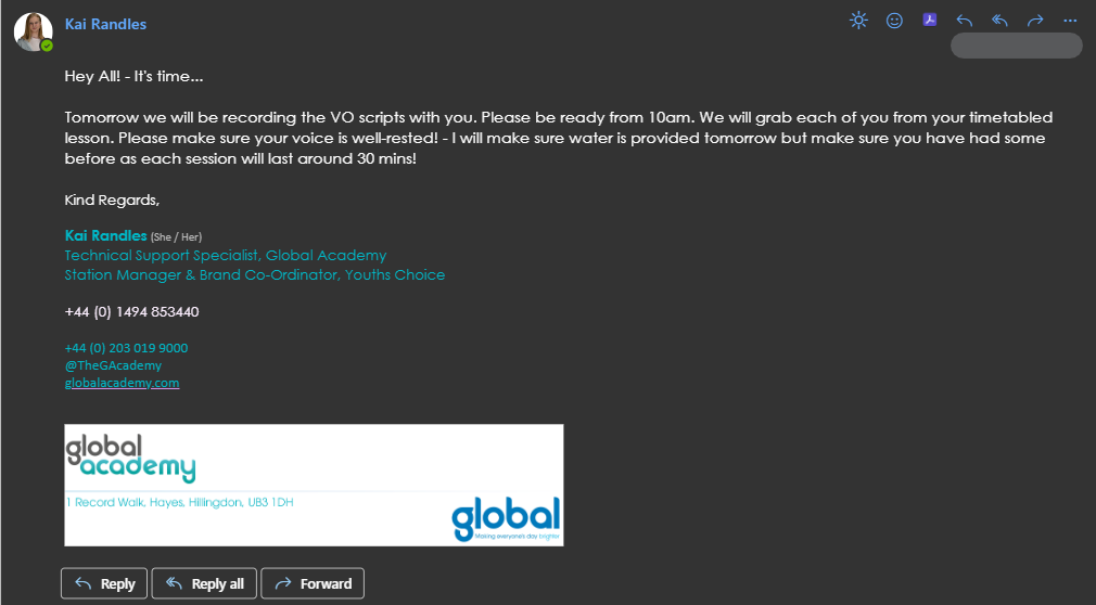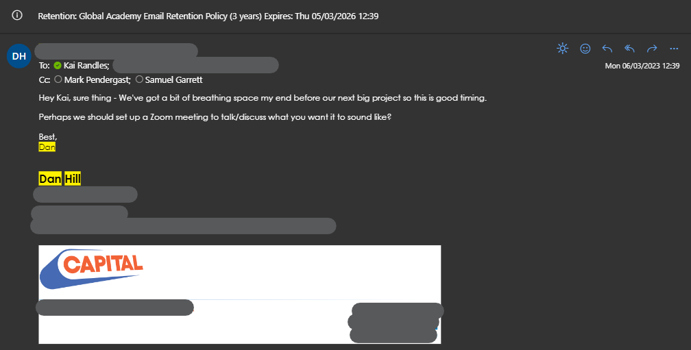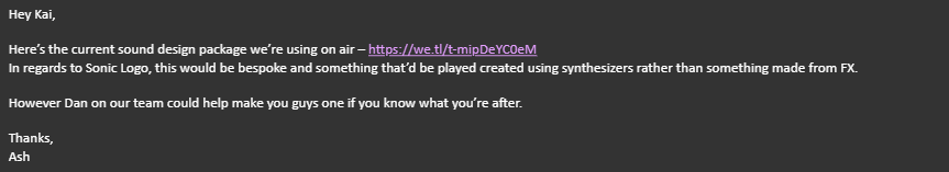 As mentioned in the above Emails. Dan Hill from Capital’s sound design team is going to support us by making a sonic logo! We had meetings and sent over examples. We then got the final product! Again in these screenshots I’ve only included the body for privacy, NDA and confidentiality reasons.