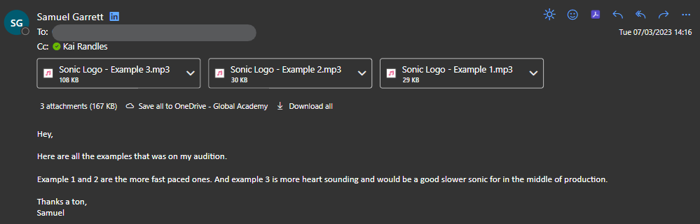 For the Sound Effects I emailed the Group Head of Brand Sound Design at Global. He gave me the current work parts that capital were using on air! – He also pointed me in the right direction for the sonic logo to be created! In these screenshots I’ve only included the body for privacy, NDA and confidentiality reasons. The link will have now expired too
